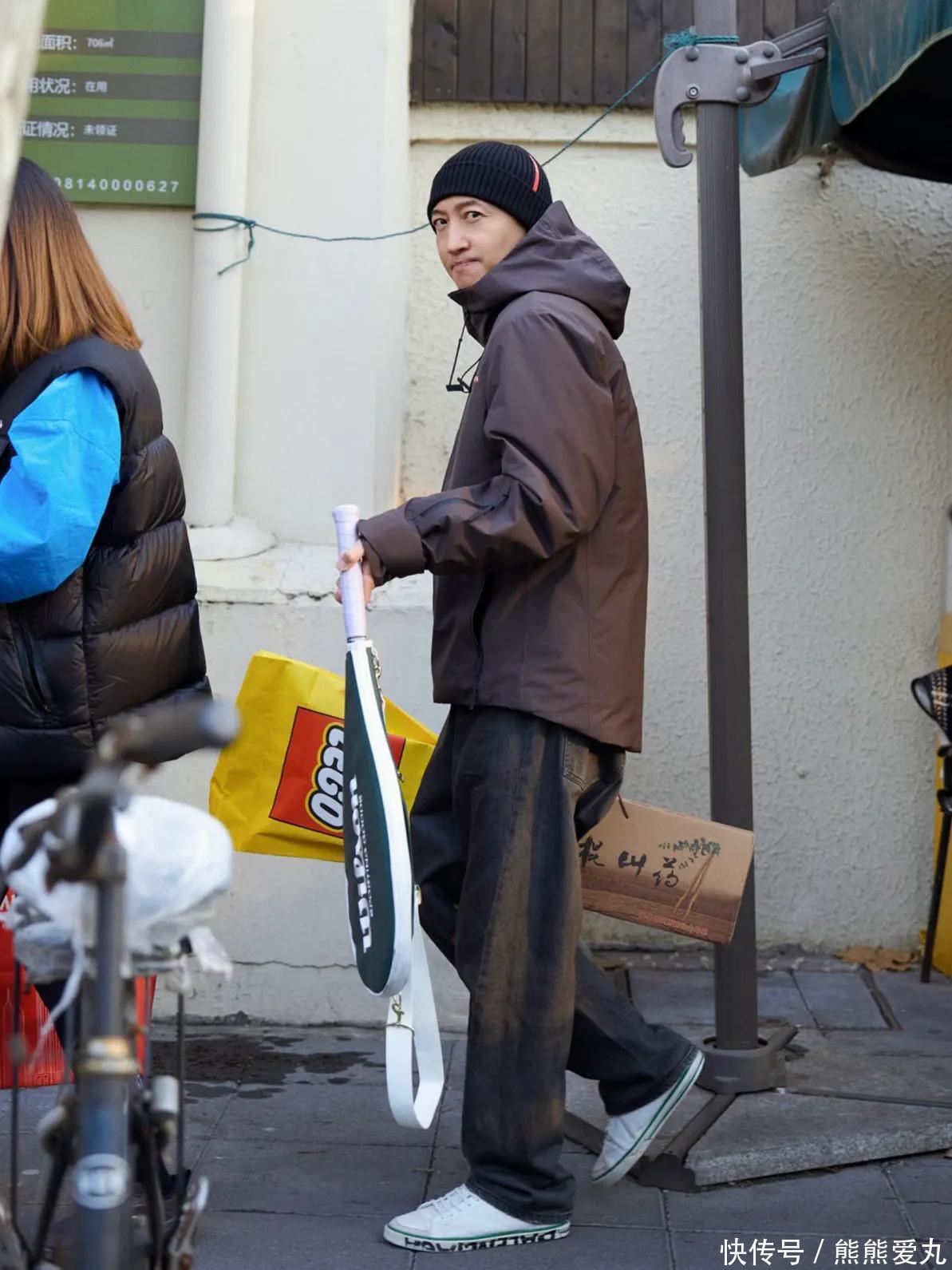 照片中,王阳头戴黑色针织帽,身穿黑色外套搭配牛仔阔腿裤,打扮潮男范十足,看起来帅气有型,真的很显年轻活力,真的不像47岁呀,看起来好帅。王阳发现了镜头,还对着镜头抿嘴微笑打招呼,看起来很亲切。他一手提着网球拍,一手拎着一个写着铁棍山药字样的纸箱,这个混搭风格造型看起来很接地气。