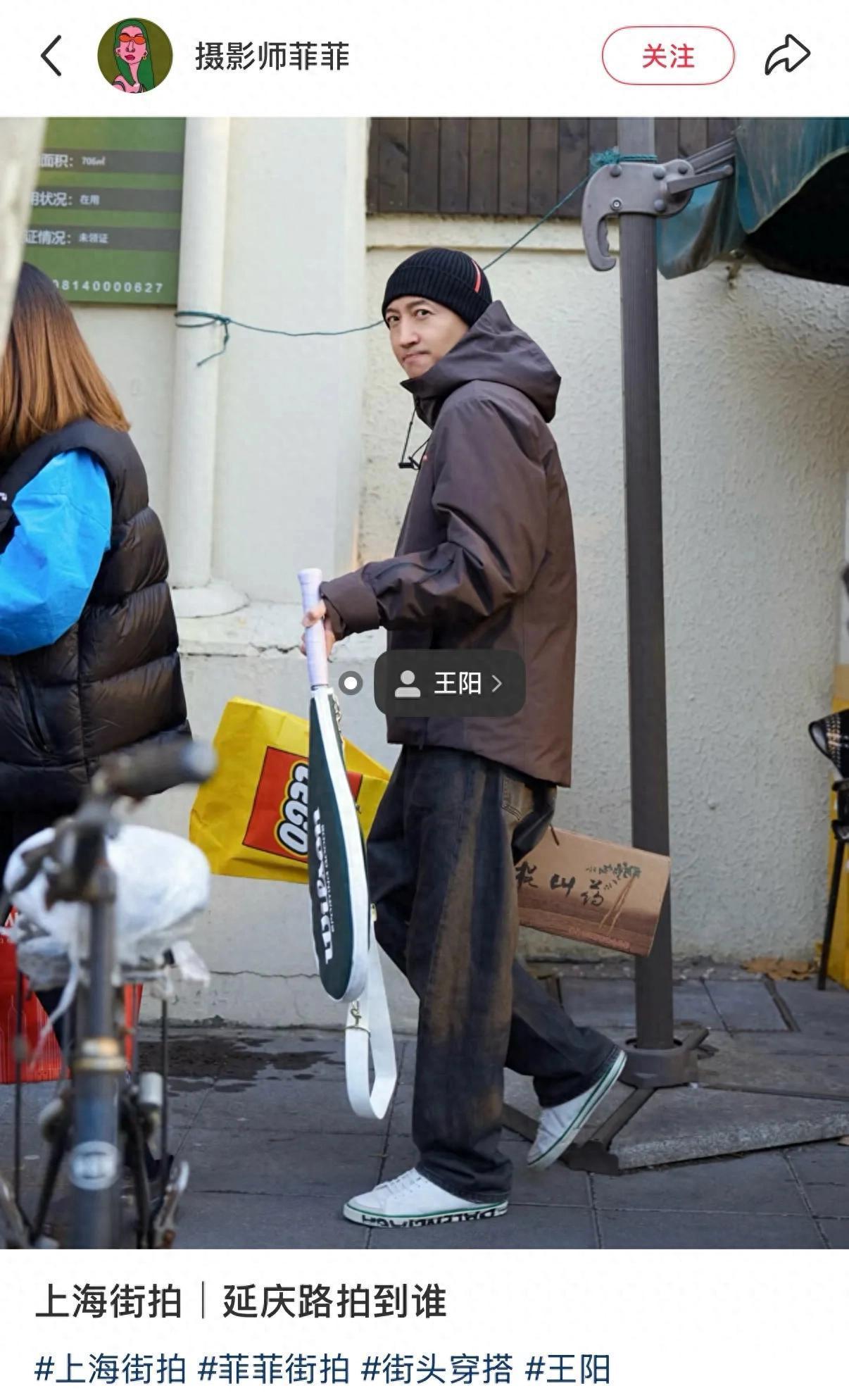1月8日,有网友晒出在安福路街头偶遇王阳的照片,王阳一手拿着球拍,一手拎着一箱铁棍山药,看起来帅气又接地气。